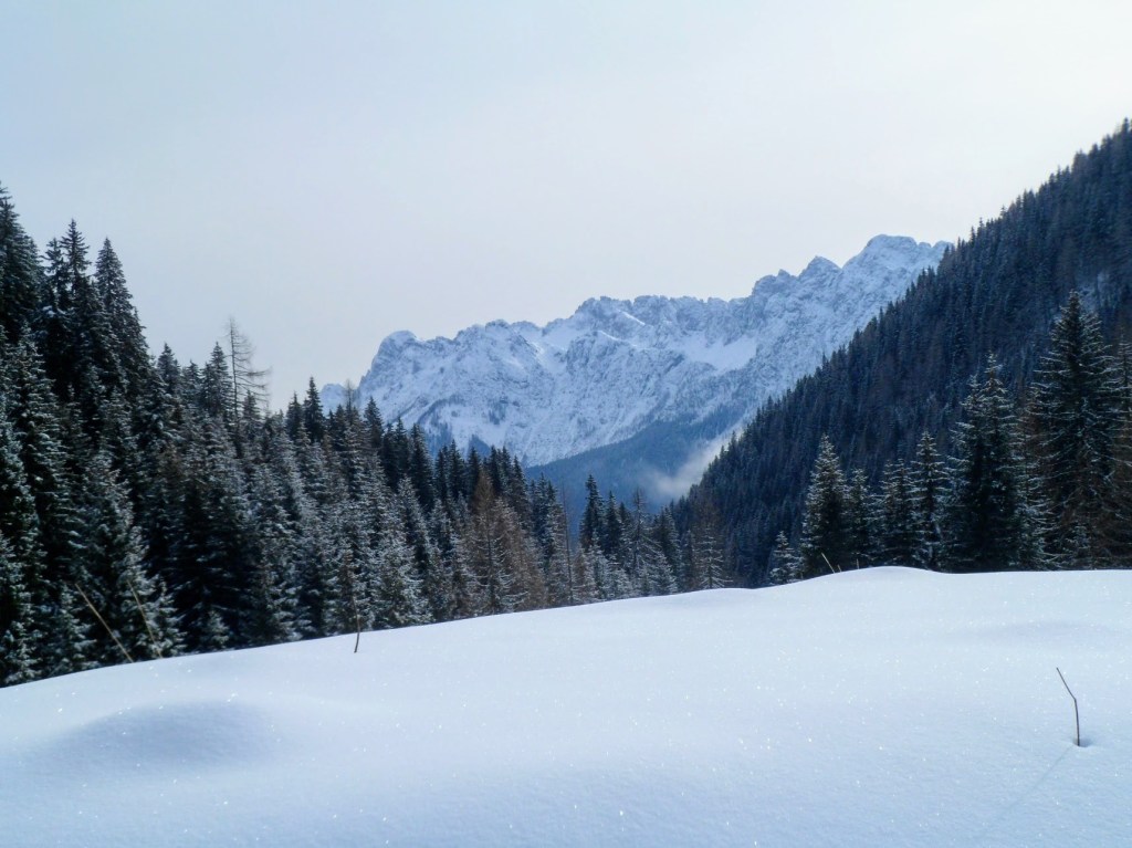 Ciaspolata tra le maghe della Val Visdende lungo la “Strada delle malghe”. La val Visdende è racchiusa a Nord dalla Cresta Carnica Occidentale, a sud dai monti dei gruppi della catena Crissin-Brentoni ed i gruppi delle Terze, Clap e Siera, a est il massiccio del monte Peralba con il vicino Chiadenis e la dorsale del monte Chiadin; e per finire ad ovest con il vicino Comelico ed il poderoso gruppo dolomitico Popera-Cima Undici-Croda Rossa. Punto di partenza dell’escursione che porta in malga Dignas è solitamente in inverno il parcheggio nei pressi de “La Fitta”; vista la presenza di poca neve sulla strada continuiamo in auto sulla strada verso il bivio Ciadon, parcheggiando a quota 1400m circa in corrispondenza di due bivii ravvicinati. Ci incamminiamo fino a raggiungere il bivio Ciadon (nei pressi del parcheggio estivo) dove proseguiamo a destra sulla pista forestale CAI 170. La strada sale regolare fino a raggiungere malga Dignas, dove incontriamo il gestore che purtroppo questo inverno non è riuscito ad aprire il rifugio per l’assenza di acqua dovuta al congelamento della sorgente. Proseguiamo sulla pista CAI 170 fino alla malga Campobon; questa casera era la meta della escursione odierna ma decidiamo di proseguire fino a malga Cecido, vista la condizione del manto nevoso ed avendo saputo da uno scialpinista incontrato a malga Dignas della presenza di una traccia di scialpinisti lungo la val Cecido. Dalla malga Campobon proseguiamo sulla pista CAI 170 fino ad intercettare la traccia di discesa 200m prima della malga Cecido; scendiamo prima sul pendio erboso e poi nel bosco fino a raggiungere a quota 1600m circa il termine della pista forestale che ci riporta nei pressi dell’auto.