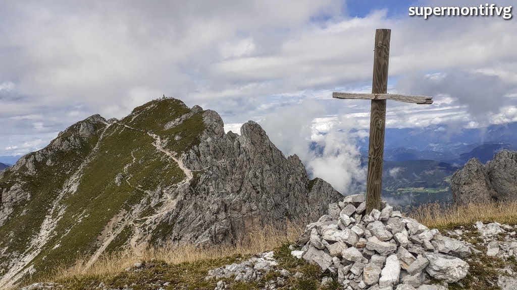 Il GARTNERKOFEL si trova Alpi Carniche Orientali e domina il comprensorio sciistico di Pramollo/Nassfeld. La via normale di salita è un percorso molto semplice, adatto a tutti, sia per difficoltà che per dislivello. In questa occasione però abbiamo scelto la più difficile cresta ovest (Westgrat), che presenta tratti molto esposti di I e II grado e che ci sentiamo di consigliare solo ad escursionisti esperti con capacità alpinistiche. Vista comunque la brevità dell’escursione, abbiamo allungato l’escursione visitando anche le cime del Kammleiten e del Gartnerkofel Sudgipfel. Bellissima giornata con panorami incredibili a 360 gradi. Punto di partenza: arrivati a Pramollo (da Pontebba), in corrispondenza dell’ex confine di stato, svoltare a destra per una rotabile asfaltata che conduce alla Watschiger Alm (ampio parcheggio). Percorso: dalla malga seguire il sentiero 410 che risale le pendici del Gartnerkofel, tralasciare a destra la via normale (che percorreremo al ritorno) e punto dritto al Kuhweger Torl, forcella a quota 1912 che divide il Gartnerkofel dal Kammleiten. Qui effettuiamo la prima deviazione di giornata, raggiungendo in breve la cima di quest’ultimo. Poi velocemente di nuovo alla forcella e, seguendo una flebile traccia, puntiamo alla via nord ovest: tratti alpinistici molto esposti si alternano a pendii erbosi, con un passaggio chiave (placca liscia di 5 metri) a poca distanza dalla cresta sommitale. Una via non banale ma molto remunerativa: consiglio per chi vuole sentirsi più sicuro di portarsi dietro una corda (ci sono alcuni punti in cui assicurarsi). Una volta in cima al Gartnerkofel, visto il solito assembramento di gente (è una cima molto frequentata), optiamo per la seconda deviazione di giornata: scendiamo lungo la via normale, e saliamo anche la cima sud (molto meno frequentata rispetto a quella principale). A questo punto, molto soddisfatti, rientriamo per la semplice via normale per gustare una super torta di mele alla Wtschiger Alm. Carta Tabacco 018 (app E11F), Dislivello 720, Sentiero 410-412 e via alpinistica Westgrat (I/II), Difficoltà EE, Lunghezza 8 km circa, Altitudine min 1625, Altitudine max 2195.