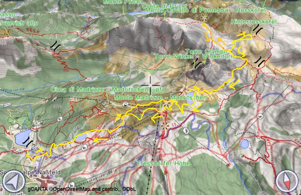 La Creta di Pricotic è una cima secondaria che si trova nel comprensorio di Pramollo/Nassfeld tra la Creta di Riosecco ed il monte Cavallo di Pontebba. E’ facilmente raggiungibile utilizzando proprio la via normale per quest’ultimo, con una deviazione nei pressi dell’antecima. Panorama incredibile a 360 gradi dalla vetta. Punto di partenza: arrivati a Pramollo da Pontebba, parcheggiare nei pressi dell’ex Confine di Stato. Percorso: subito dopo aver oltrepassato l’ex confine girare a sinistra su una pista forestale in direzione monte Madrizze (cartelli). Dopo aver superato un bacino artificiale si può optare per salire dal sentiero Cai 403 che risale il versante sud del monte fino all’omonima sella. Nei pressi del laghetto di Sella Madrizze si stacca un sentiero, con sassi di grosse dimensioni (richiesto passo sicuro) e tratti franati, che risale il versante sud della Creta di Pricotic fino ad un selletta di quota m.2050. Svoltare poi a sinistra, risalire un centinaio di metri, e poco sotto il piano erboso sommitale del monte Cavallo, deviare a sinistra (in corrispondenza di un paletto di legno) e puntare alla Creta di Pricotic. Raggiungiamo la cima, infine, utilizzando i ripidi prati della cresta sud. Per la discesa stesso percorso. Vista la giornata fotonica dal punto di vista meteo, per questa occasione abbiamo deciso di effettuare una deviazione anche sulla cima del monte Cavallo. Carta Tabacco 018, Dislivello 850, Difficoltà E, Lunghezza 10, Altitudine min 1530, Altitudine max 2239.