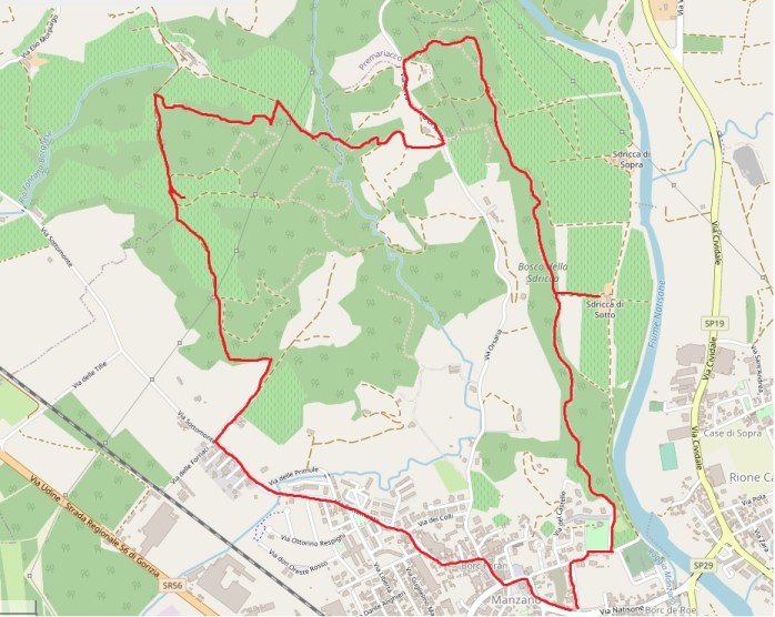 21/02/2021 – L’anello della Sdricca si sviluppa nei boschi e nei vigneti a nord di Manzano, lungo la sponda destra del fiume Natisone. Il sentiero è stato recentmente segnalato come sentiero CAI 770. Punto di partenza può essere Piazza Chiodi oppure il parcheggio difronte alla sede municipale, in via Foschiani. Scegliendo questa seconda opzione, si risale verso nord via Foschiani e al successivo incrocio si gira a destra, raggiungendo il retro del cimitero. Si devia a sinistra su via Belvedere e si giunge ai ruderi del castello medioevale; poco sopra il sentiero prosegue nel bosco della Sdricca verso nord. Dopo circa 15 minuti di cammino dai ruderi del castello, una breve deviazione sulla sinistra porta ad un belvedere sulle colline. Rientrati sul sentiero principale che si snoda nel sottobosco, sulla destra si notano le località di Sdricca di sotto e Sdricca di sopra. La prima località è raggiungibile con una breve deviazione mentre per raggiungere Sdricca di sopra, luogo di addestramento del corpo degli Arditi durante la Grande Guerra, la deviazione è più lunga. Dopo circa un’ora di cammino dalla partenza si lascia il bosco della Sdricca e si raggiunge una strada asfaltata, via Orsaria, che si segue a sinistra per alcune centinaia di metri. Si supera l’azienda Ronco Pitotti e si prosegue a destra sui versanti coltivati a vigneto. Si attraversa il boschetto del rio Manzanizza e si risale poi verso il palazzo De Marchi-Ottelio. Il boschetto attorno al rio risulta particolarmente fangoso in caso di piogge recenti. Con alcuni saliscendoi si perviene ad una carareccia che attraversa i vigneti a nord-ovest di Manzano, fino a giungere ad un belvedere con panchina che invita alla sosta. Si prosegue sulla carrareccia e si scende verso via Sottomonte. Si seguono le vie di Manzano e si ritorna al parcheggio nei pressi del Municipio.