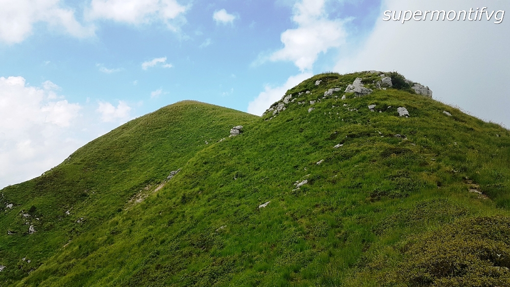 31/07/2021 – Il monte Cormolina (1873m) si trova a nord del monte Verzegnis o Pizzat (1914m); assieme al vicino monte Lovinzola è percorso dal “sentiero delle creste” che permette di salire sulle tre principale cime del gruppo. Punto di partenza è la sella Chianzutan, nell’ampio parcheggio; lungo la strada, sul lato opposto del parcheggio, si trovano le tabelle del sentiero CAI 806; si attraversa un prato e poi il sentiero sale nel bosco di faggio che caratterizza il versante sud del Colle dei Larici. Dopo pochi minuti il sentiero arriva nei pressi di un tornante della strada asfaltata che sale a casera Mongranda. Invece di proseguire sulla strada asfaltata e in prossimità della casera proseguire a destra sul CAI 809, abbiamo seguito la pista forestale che si stacca dal tornante, incontrando poco dopo sulla sinistra un sentiero bollato che ci ha riportato sulla pista forestale CAI 809. Si prosegue sulla pista CAI 809 denominata “Strada del marmo”, che poi diventa sentiero, che traversa le pendici meridionali del Colle dei Larici. Giunti a quota 1300m circa, si incontrano sulla sinistra le indicazioni per il Colle dei Larici, che tralasciamo, fino a giungere allo spiazzo che ospita la casera Presoldon (o Presaldon), ristrutturata e ottimo ricovero (circa 1 ora e 15 minuti dalla partenza). Si prosegue sulla strada forestale, di servizio alla cava di marmo, e dopo pochi minuti, al tornante, proseguiamo sul sentiero CAI 809 che, con qualche saliscendi, traversa le pendici settentrionali del monte Lovinzola, fino a portarci ai prati che ospitano la casera Lovinzola di sopra, adibita a ricovero (circa 1ora e 20 minuti da casera Presoldon). Poco prima della casera il sentiero CAI 809 si immette sul sentiero CAI 806 proveniente da Invillino. Dalla casera si prosegue sul sentiero CAI 806; dopo 15 minuti si giunge ad un pianoro molto suggestivo, incontrando il bivio con il sentiero CAI 807, che prosegue verso la forca Rizzat. Si prosegue a sinistra sul CAI 806 raggiungendo la forca Cormolina (circa 40 minuti dalla casera Lovinzola di sopra). Qui si intercetta il sentiero delle creste, che a sinistra porta verso il monte Lovinzola e a destra verso i monti Cormolina e Verzegnis; si sale a destra, dapprima superando alcuni salti rocciosi e poi per pendio erboso, fino a raggiungere il paletto in legno sulla cima del monte Cormolina (circa 10 minuti dalla forca Cormolina). Dalla cima scendiamo lungo il sentiero di cresta verso la selletta che divide il Cormolina e il Verzegnis; dalla selletta scendiamo a sinistra su un sentiero eroso e un po’ malagevole fino alla casera Val (con ricovero). Dalla casera scendiamo a sella Chianzutan con il sentiero CAI 806, con piacevole sosta a casera Mongranda (vendita di prodotti caseari) dove Ivan vi racconterà dei suoi incontri con l’orso Francesco. Per la discesa da casera Val, in alternativa al sentiero CAI 806, si può percorrere il “Sentiero dell’Agarat” recentemente rispristinato, che scende nel canale psoto ad ovest del sentiero CAI 806, e che riconduce a casera Mongranda per pista forestale (mappa del sentiero a questo link).
