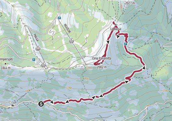 Si parte dal parcheggio nei pressi del locale “Nif Alpinetast“, che si trova alla fine del paese di Vetriolo Terme. Sulla sinistra parte la pista forestale contraddistinta come sentiero SAT 309 (sentiero europeo E5 e Translagorai), che in circa 1 oretta porta al pianoro che ospita la malga Masi, chiusa. All’inizio la pista sale ripida, per poi diminuire la pendenza. La pista traversa il versante sud della cima Panarotta e nell’ultimo tratto, poco prima di arrivare alla malga, si perdono una ventina di metri di quota. Purtroppo per più di tre quarti della salita il bosco è stato completamente devastato dalla tempesta Vaia e pertanto si cammina sotto il sole. Nei pressi della malga Masi si trovano le indicazioni per “La Bassa”, forcella posta a nord della malga, tra il monte Panarotta e il monte Fravort. La forcella si raggiunge per pista forestale che parte dietro la malga e con alcuni tornanti raggiunge il pianoro detto “La Bassa”. Dal pianoro si osserva a sinistra la traccia che sale verso la cima Panarotta (1 ora e 40 minuti circa dalla partenza), caratterizzata da una croce e numerose antenne di telecomunicazioni. Sono inoltre state recuperate alcune trincee austro-ungariche della Grande Guerra. Si rientra a Vetriolo Terme lungo lo stesso percorso effettuato all’andata. Dalla cima esiste un sentiero SAT che scende diretto lungo il versante sud della cima Panarotta, che però risulta inagibile per schianti dovuti alla tempesta Vaia.