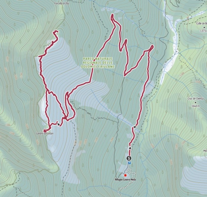 02/10/2021 – Si parte per un weekend tra i monti della val Zemola, con pernotto nel rifugio Cava Buscada. Le previsioni per sabato sono buone mentre domenica purtroppo troveremo una giornata nuvolasa. Giunti in auto ad Erto si seguono le indicazioni per la val Zemola e si parcheggia al termine della strada, nel parcheggio nei pressi dell’agriturismo casera Mela (parcheggio a pagamento, 3 euro al giorno; munirsi di monete). Al termine del parcheggio due piste si inoltrano nella val Zemola; seguiamo la pista di sinistra, che all’inizio coincide con il sentiero CAI 374. Poco prima di casera Ferrera lasciamo a destra il sentiero CAI 374 per casera Galvana e la pista per il rifugio Maniago e proseguiamo salendo verso casera Bedin di sopra il versante destro della valle, al di sotto del monte La Palazza. Dopo aver passato un primo tornante si incontra la pista di servizio della cava che sale da casera Mela; la strada continua a salire e dopo 3 tornanti incontriamo sulla destra le indicazioni per il sentiero CAI 381 per il rifugio Maniago (che percorreremo il giorno successivo). Si prosegue per la strada, si attraversa una galleria, e si giunge al rifugio Cava Buscada, aperto nel 2010 e ricavato nell’edifico che fungeva da alloggio per i cavatori. Alleggerito lo zaino, l’obiettivo della giornata è visitare il Landre dal Ledan e salire al monte La Palazza. Per salire al Landre dal Ledan, seguiamo le indicazioni del gestore Gianpietro: passato il rifugio, saliamo il sentiero del giardino botanico e raggiungiamo la pista interna alla cava, nei pressi di un tornante. Saliamo dietro il tornante su una pista un po’ inerbita e seguiamo la traccia che ci porta sulla cresta sopra forcella Borgà, nei pressi di un paletto in legno. La vista è dominata dalla parete nord del monte Borgà. Per visitare il Landre dal Ledan seguiamo la traccia che scende e in pochi minuti raggiungiamo la grotta. Dopo la visita si risale alla forcella nei pressi del paletto in legno; per raggiungere la cima della Palazza dobbiamo raggiungere il sentiero (non segnalato) che dalla cava risale il versante sud de La Palazza. Dalla forcella dobbiamo traversare rimanendo più o meno in quota il pendio che sovrasta la cava; si deve cercare di rimanere nella parte erboda del pendio, rimanendo al di sopra della zona rocciosa, dove sono presenti alcuni solchi profondi tra le rocce che rendono difficoltosa la camminata. Traversando si trovano alcune tracce e in circa 20 minuti raggiungiamo la evidente traccia di salita a La Palazza. Si sale con un po’ di fatica in un primo tratto con rocce solcate e pini mughi; successivamente si esce sul pendio erboso e si lambisce la cima del monte Buscada e l’antecima de La Palazza. Per raggiungere la cima, si oltrepassa l’antecima e si raggiunge la sella tra cima e antecima. Si prosegue seguendo la traccia che sale la cima da ovest; il sentiero traversa un pendio molto ripido (attenzione). Per scendere, seguiamo la traccia percorsa per la salita, continuando a scendere fino a raggiungere la cava e il rifugio.