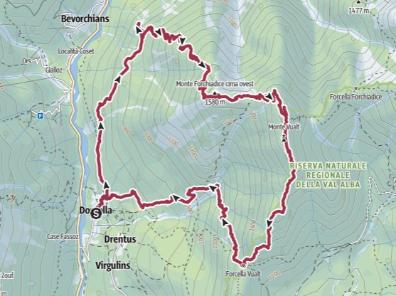 24/10/2021 – Il monte Vualt si trova tra la val Alba e la val Aupa. Si può raggiungere da entrambe le vallate, con dislivello maggiore partendo dalla Val Aupa. Punto di partenza della escursione è il paese di Dordolla, che si raggiunge dalla val Aupa, con possibilità di parcheggio nei pressi della chiesa. Si seguono le tabelle in legno CAI 422 e 425, camminando tra le viuzze del paese. Passate le ultime case, si incontra il bivio CAI 422-425; proseguiamo a sinistra in traverso sul sentiero CAI 422, mentre utilizzeremo il sentiero CAI 425 al rientro. Il sentiero CAI 422 si dirige verso nord con pendenza moderata. Dopo circa 1ora di camminata si incontra una tabella in legno che segnala una deviazione a sinistra in discesa che porta a visitare una caverna della Grande Guerra (circa 15 minuti per visitare la grotta e rientrare sul sentiero CAI). Rientrati sul CAI 422 la mulattiera sale a tornanti e con pendenza moderata il versante ovest (in ombra nel periodo autunnale) del monte Forchiadice. Dopo circa 1 ora e 20 minuti di salita dal bivio per la caverna della Grande Guerra si aggira verso sud il monte Forchiadice e si raggiunge un punto panoramico (al sole) a quota 1520m verso la val Aupa. Si prosegue sulla mulattiera CAI 422 e dopo pochi minuti si incontra sulla sinistra una tabella in legno che indica la possibilità di raggiungere la cima ovest del monte Forchiadice (deviazione di pochi minuti – 2 ore e 45 minuti dalla partenza). Rientrati sul CAI 422 si prosegue verso est e si raggiunge il Cjasut dal Scior, a quota 1740m (3 ore e 25 minuti dalla partenza, escluse soste); a metà del percorso tra monte Forchiadice e Cjasut si incontra sulla destra una tabella in legno con la scritta “la lope” che indica un sentiero che scende verso Dordolla, immettendosi sul sentiero CAI 425. Dal Cjasut dal Scior si seguono le indicazioni “Belvedere” che portano verso nord alla quota 1760m del monte Vualt (pochi minuti dal Cjasut). Per il rientro a Dordolla utilizziamo il sentiero “Palis d’arint” che raggiunge forcella Vualt e poi tramite il sentiero CAI 425 si scende a Dordolla. In alternativa si può utilizzare il sentiero “la lope” incontrato in salita, prima del Cjasut dal Scior. Il sentiero “Palis d’arint” parte nei pressi del Cjasut dal Scior e segue la cresta verso sud del monte Vualt. Dopo pochi minuti dal Cjasut si incontra la quota 1740m del monte Vualt, con croce. Si prosegue verso sud e si incontrano due ripide discese una di seguito all’altra; in alternativa alla traccia che scende ripida dritta per dritta sono state creati anche dei varchi a sinistra tra i mughi che permettono di scendere a tornanti, con minor pendenza. Proseguendo sul “Palis d’arint” si compie un tratto in costante discesa ed infine si affronta la terza e ultima discesa ripida, entrando nella faggeta attorno alla forcella Vualt. Giunti alla forcella (1ora e 20 minuti dal Cjasut dal Scior) si scende a destra sul sentiero CAI 425, passando per Plan di Tamar e Plan di çarniculis. Si raggiunge il bivio, toccato all’andata, con il sentiero CAI 422 e si prosegue in discesa raggiungendo le case di Dordolla.