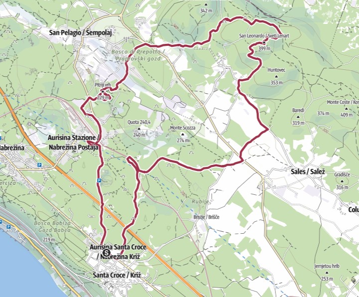 31/10/2021 – Con questa escursione si effettua un anello raggiungendo la cima del monte San Leonardo nel Carso triestino, partendo da Santa Croce e visitando il parco Lupinc. A Santa Croce si può parcheggiare sulla strada principale all’altezza dei campi sportivi. Dal parcheggio si segue per alcune decine di metri la strada SP1 verso sud-est e si prende a sinistra la strada sterrata (sentiero CAI n°10, segnavia sul palo della luce). Si segue la strada per circa 100 metri e si devia a sinistra sul CAI 10 per sentiero che ci porta nei pressi del sottopassaggio sotto l’autostrada. Oltrepassata l’autostrada si si sale a destra e subito a sinistra, seguendo sempre il sentiiero CAI n°10. Si prosegue fino ad incontrare la sede ferroviaria, che si supera tramite sottopassaggio. Proseguendo sul sentiero CAI 10 si supera l’incrocio con il sentiero CAI 19, svoltando a sinistra. L’idea era di proseguire sul sentiero CAI 10 fino a Samatorza ma, sbagliando direzione al bivio successivo, ho proseguito sul sentiero CAI 36 fino alla strada provinciale SP6 nei pressi di Sales. Si attraversa la strada asfaltata e si prosegue per alcune decine di metri verso nord-ovest fino ad incontrare una strada sterrata sulla destra, nei pressi di un allevamento di asini, che ci porta alla strada asfaltata tra Sales e Samatorza. Si prosegue a sinistra sulla strada asfaltata e si giunge a Samatorza; si può raggiungere il paese acnhe in modo più diretto rimanendo sempre sul sentiero CAI 10, compiendo anche una breve deviazione per visitare la grotta Azzurra. Giunti a Samatorza si seguono le tabelle in legno (sentiero CAI 10) che segnalano il sentiero che sale al monte San Leonardo (circa 1ora e 45 minuti dalla partenza, escluse soste), sulla cui panoramica cima si trovano i resti di una chiesa (altre informazioni a questo link). Si scende verso nord-est sul sentiero CAI 10 e si intercetta il sentiero CAI 3 e lo si segue a sinistra, con destinazione il paese di Ternova. Lungo la sterrata (CAI 10) che ci porta a Ternova si può visitare l’ingresso della grotta di Ternovizza. Da Ternova, lungo il sentiero CAI 10, per strade asfaltate, si raggiunge Prepotto. Superato il paese, si continua sul sentiero CAI 10-35 e si scende attraversando una vigna e seguendo le tabelle in legno del parco Lupinc. Alla fine del pendio che ospita la vigna lasciamo a destra il sentiero CAI 10 che prosegue verso San Pelagio e proseguiamo a sinistra. Subito dopo si lascia la sterrata CAI 35 e si scende a destra seguendo le tabelle in legno del parco Lupnic, oltrepassando un cancello che permette di scendere alla grotta Lesa Griznica; si attraversa la grotta/arco e, seguendo le tabelle in legno, si raggiunge il parco Lupinc, con panchine e tavoli nei pressi della cima Pitnji Vrh (circa 1 ora dal monte San Leonardo), con punto panoramico. Dalla cima si seguono le tabelle in legno “alla vecchia fornace”. Si giunge alla vecchia cava e alla fornace; oltrepassata la fornace si giunge alla strada provinciale SP5 e tramite le indicazioni del sentiero CAI 35 si giunge alla case di Frnaza, si attraversa la ferrovia tramite il nuovo ponte e seguendo le indicazioni per gli impianti sportivi si rientra verso Santa Croce. Questa ultima parte della escursione, dalla immissione sulla strada SP5 agli impianti sportivi di Aurisina (campi di tennis e pista da sci) si svolge su strade asfaltate. L’ultimo tratto tra gli impianti sportivi e Santa Croce è su pista sterrata.