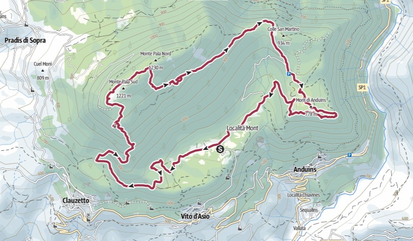 Carta Tabacco 028, sentieri locali e strade sterrate, Dislivello 750m, Lunghezza km 14,5, Tempo indicativo 4h30m (escluse soste), Difficoltà E, Altitudine min 640m, Altitudine max 1225m.