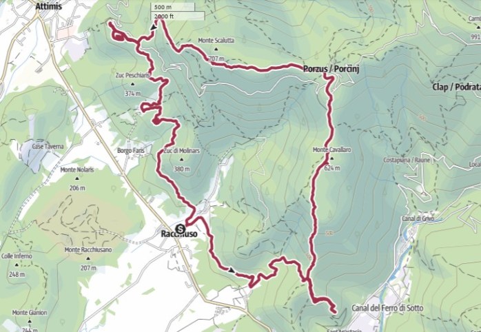 La partenza avviene dal paese di Racchiuso, tra Attimis e Faedis, dove si può parcheggiare l’auto nei pressi della chiesa del paese. Si prosegue a piedi lungo via Canalutto; dopo circa 100 metri si gira a destra (seconda via) e si continua su strada sterrata fino a raggiungere le case di Poiana di sotto. Si prosegue sulla strada asfaltata che in salita porta a Poiana di sopra. Si attraversa il borgo e subito dopo aver oltrepassato le ultime case si incontra un bivio: a sinistra il sentiero 10 sale al Cjondar des Paganis mentre noi proseguiamo a destra seguendo le indicazioni del sentiero 9 per Porzus (via monte Cavallaro) e per i castelli di Faedis. In circa 15 minuti si raggiunge un trivio; a destra si scende a Faedis passando per la chiesa di San Rocco, dritti si scende ai castelli di Faedis (Cucagna e Zucco) e a sinistra si sale verso Porzus (sentiero 9). L’itinerario prevede di compiere la deviazione per visitare i castelli di Faedis e tornare a questo trivio, dove si proseguirà salendo a Porzus. Pertanto al trivio scendiamo ai castelli, visitando prima il castello di Cucagna (non visitabile, recinzione di cantiere) e poi il castello di Zucco e la chiesa di Madonna di Zucco. Questa deviazione per la visita dei due castelli comporta una discesa (e risalita) di 80 metri, impiegando circa 25-30 minuti. Tornati al trivio si prosegue in salita sul sentiero 9, che nei primi 250 metri sale in modo deciso. Giunti a quota 570 metri circa il sentiero diminuisce di pendenza e passa accanto alla cima del monte Cavallaro; subito dopo incontriamo la tabella del sentiero 8 che sale da Canalutto. Si prosegue verso nord sul sentiero 9, che ci porta fino al cimitero di Porzus (circa 2 e 10 minuti dalla partenza). Dal cimitero si raggiunge la piazza di Porzus (punto più alto dell’anello) difronte alla chiesa, dove la domenica si può trovare aperto il chiosco della proloco di Porzus (chiuso durante i mesi invernali) (circa 2 ore e 20 minuti dalla partenza). Dalla piazza si seguono le indicazioni dei sentieri 1 e 6, che scendono il primo ad Attimis e il secondo a Canalutto. Il sentiero 1 inoltre coincide con il sentiero CAI 765. Seguendo i sentieri 1-6, dopo poche decine di metri, si trovano a destra le indicazioni del sentiero 3 che scende a Forame. Si prosegue sul sentiero CAI 765 (e locali 1 e 6) che transita nei pressi del monte Scalutta; dopo circa 25 minuti si raggiunge il bivio tra i sentieri 1 e 6 e si prosegue a destra sul sentiero 1 (anche CAI 765), fino a intercettare la strada asfaltata che da Attimis sale a Porzus. Dalla strada asfaltata proseguiamo sul sentiero 1 per visitare i castelli di Attimis (superiore ed inferiore). Tornati alla strada asfaltata, seguiamo le indicazioni del sentiero 4 per il castello di Partistagno e i borghi di Felessin e Faris. Il sentiero 4 compie prima un traverso e poi sale per circa 40 metri; successivamente si scende verso le case di borgo Felessin; oltrepassato l’agriturismo Sogni d’Oro, si sale a sinistra verso il castello di Partistagno e la chiesa di Sant’Osvaldo (circa 40 minuti dai castelli di Attimis). Visitato il castello di Partistagno, si prosegue sulla strada sterrata (sentiero 5 che scende verso il borgo di Faris); al bivio sopra Faris si lascia a destra la strada che scende al borgo e si prosegue a sinistra lungo la sterrata che traversa il versante sud dello Zuc di Molinaris e scende a Racchiuso (30 minuti dal castello di Partistagno).