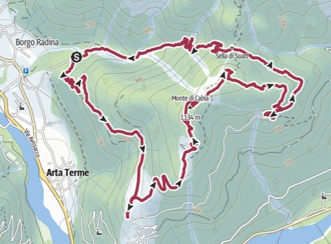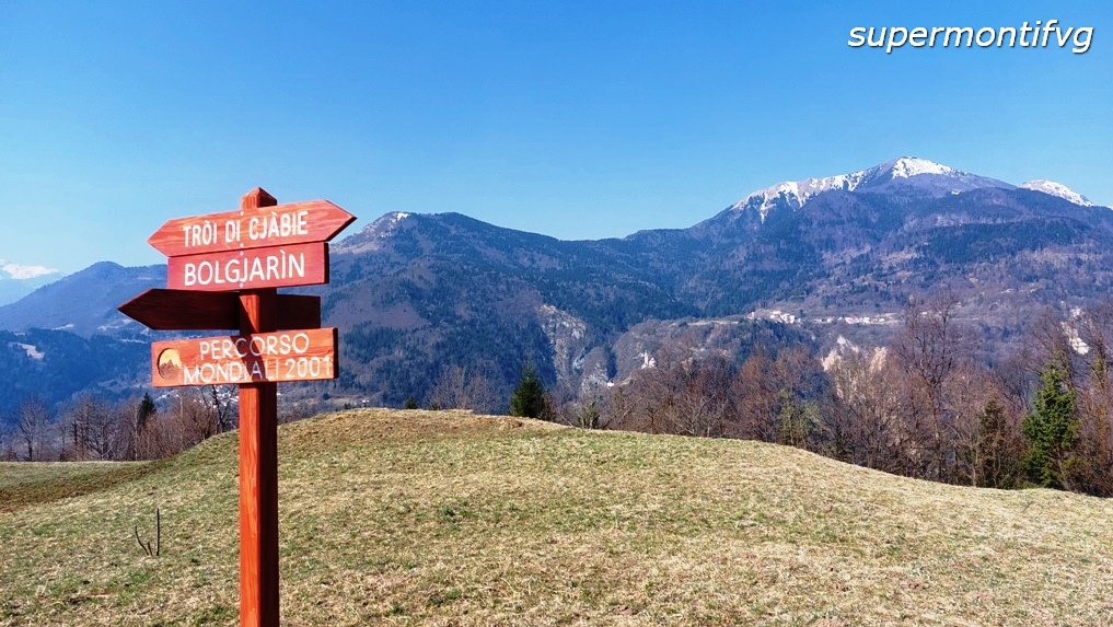 27/03/2022 – L’anello si svolge ad est di Arta Terme, sul monte Cabia, monte caratterizzato da più cime, la più alta posta ad est e a quota 1146 metri. Giunti ad Arta Terme si raggiunge il borgo Radina e si prosegue sulla strada asfaltata, trovando parcheggio presso uno spiazzo posto a sinistra. L’anello prevedeva di percorrere il Troi di Cjabie, che parte poco prima dello spiazzo dove si parcheggia, sulla sinistra scendendo dallo spiazzo verso Arta Terme. Il sentiero è però inagibile nel primo tratto per i lavori che interessano il versante nord-ovest del monte Cabia per la realizzazione di una pista forestale; un tratto del vecchio sentiero è stato definitivamente cancellato dalla nuova viabilità. Conviene pertanto parcheggiare cento metri più avanti nei pressi del ponte sul rio Radina, dove sulla destra parte la nuova pista forestale (la traccia GPS allegata segue all’inizio i primi metri del Troi di Cjabie per poi collegarsi alla nuova strada forestale). Ad un tornante della nuova pista forestale si trovano le indicazioni del Troi di Cjabie; noi abbiamo tralasciato questa indicazione e abbiamo seguito la nuova pista fino ai prati degli stavoli a quota 765m, dove abbiamo traversato verso sud e intercettato il Troi di Cjabie. Seguendo il sentiero si perviene ad una pista sterrata nei pressi di un tornante e si segue la pista a sinistra in leggera salita; successivamente si perviene ad un bivio e si segue la pista in discesa a destra, raggiungendo i pendii degli stavoli Boglierin. Dall’incrocio siamo scesi per poche centinaia di metri per osservare il paese di Cabia dall’alto. Rientrati all’incrocio siamo saliti sulla pista asfaltata verso il monte Cabia, che transita prima nei pressi degli stavoli Boglierin e successivamente oltrepassa gli stavoli Chiagnon. La pista asfaltata finisce poco sopra gli stavoli Chiagnon, nei pressi di uno slargo con panchina, dove si incontrano le indicazioni del sentiero CAI 411 che prosegue verso gli stavoli Cusin. Noi non seguiamo il sentiero CAI 411 (che ritroveremo più avanti) me proseguiamo per la pista sterrata, che permette di raggiungere tutte le quote principali del monte Cabia. Le prime tre (senza nessun cippo o croce) sono: quota 1123m che si trova sulla destra della pista; quota 1126m che si trova subito dopo la quota 1123m, a sinistra della pista; quota 1134m sulla destra della pista). La quarta quota, di quota 1146m, indicata da un grande cippo in cemento di trova sulla sinistra della pista e si raggiunge seguendo i segnavia del sentiero CAI 411 (tralascaire i primi segnali CAI che si incontrano sulla pista perchè il sentiero CAI fa una curva larga e rientra sulla pista poche centinaia di metri più avanti). Nei pressi del cippo di cemento si trova anche la tabella che segnala la prosecuzione del sentiero CAI 411 verso la sella Suart. Noi non seguiamo il sentiero CAI e torniamo alla pista sterrata (passando accanto ad uno stavolo posto nei pressi del cippo) e proseguiamo verso est. La pista si esaurisce e si trasforma in un sentiero ben battuto che scende verso sud-est, fino a raggiungere il pianoro che ospita gli stavoli Corona (o Carone). Poco prima degli stavoli, si giunge ad un bivio che indica a sinistra il sentiero CAI 411 verso sella Suart. Il pianoro e gli stavoli invitano alla sosta per il pranzo. Risaliti al bivio, seguiamo il sentiero CAI 411che in leggera salita porta alla sella Suart, passando nei pressi di 3 stavoli lungo il sentiero (c’è un breve tratto franato del sentiero nei pressi di un torrente). Giunti alla sella Suart incontriamo il sentiero CAI 410 che a destra sale verso casera Valmedan alta; noi proseguiamo dritti in discesa con il sentiero che a tornanti conduce prima al letto del rio Radina e poi allo spiazzo dove abbiamo lasciato l’auto. Utile avere una app con mappa digitale per individuare le varie cime e per seguire il sentiero che dal cippo di cemento scende agli stavoli Corona.