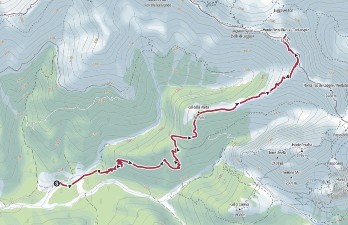 10/07/2022 – Il monte Pietra Bianca (Torkarspitze in tedesco) si trova sulla linea di confine tra Italia ed Austria nella zona nordorientale della Val Visdende. E’ raggiungibile proprio da quest’ultima tramite sentiero che richiede una buona preparazione fisica ma che non presenta difficoltà, tranne per l’ulitmo tratto che si svolge su roccette e che consente di giungere alla cima del monte. Panorama incredibile a 360 gradi dalla cima. Punto di partenza: arrivati in Val Visdende (nel periodo estivo ticket parcheggio 8 euro intera giornata), ci dirigiamo verso il borgo Costa d’Antola. Di fronte al ristorante Da Plenta c’è un ampio parcheggio, dove possiamo parcheggiare nei pressi del ponte sul rio Lavazei. Dal parcheggio si transita sul ponte seguendo le indicazioni del sentiero CAI 170 “Strada delle malghe”. Poche decine di metri dopo il ponte si prosegue a sinistra, lungo la pista che sale a malga Chivion (CAI 170) e che sale un pendio pesantemente colpito dalla tempesta Vaia. Giunti a malga Chivion, si segue per poche decine di metri la pista forestale (CAI 170-403A) verso nord-est che porta a malga Antola e si sale a destra lungo la pista utilizzata per l’esbosco che risale il pendio sud del Col della Varda (CAI 172). Salendo il pendio la pista si trasforma in sentiero che raggiunge dapprima il Col della Varda e poi prosegue lungo la dorsale sud-ovest della Cima della Varda. Giunti sotto la Cima della Varda il sentiero devia verso nord-est, compiendo un traverso a quota 2500 m circa in direzione del monte Pietra Bianca / Torkarspitze. Giunti alla base del torrione di roccia del Torkarspitze si devono affrontare ancora 70 metri circa di salita su roccette con un passaggio di primo grado per raggiungere la vetta (croce di legno). Per il rientro si segue a ritroso lo stesso percorso effettuato all’andata.