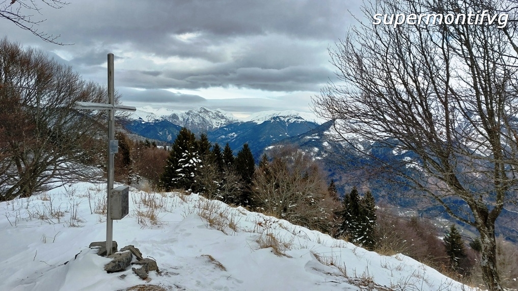 22/01/2023 – Il monte Duron e il monte Cuar sono due cime che si trovano a nord-ovest di Tolmezzo, sulla sponda destra del torrente But. Il punto di partenza della escursione si trova nei pressi dell’altopiano di Curiedi. Da Toolmezzo si sale a Fusea, si prosegue in auto verso Lauco; giunti sull’altopiano di Curiedi si sale in auto a destra seguendo le indicazioni per il rifugio Fornas. Dopo 300 metri circa si incontra un bivio (tabella stradale “località Fornace-Dispieris-Chioz”), dove a sinistra si scende verso il rifugio Fornas. Proseguendo diritti parcheggiamo subito dopo il bivio, a destra. Ci si incammina a piedi lungo la strada asfaltata che porta a sella Duron. Poco sotto la sella si lascia la strada che continua in traverso sui versanti ovest dei monti Duron e Cuar e si sale a destra a sella Duron, con il panorama che si apre verso il monte Amariana difronte a noi. A nord della sella si vede il monte Duron e si sale alla cima per il versante erboso fino alla cima del monte Duron (circa 50 minuti dalla partenza). Dalla cima si continua verso nord e si scende alla sella tra il monte Duron e il monte Cuar. Per salire sul monte Cuar saliamo il pendio verso sinistra e a metà pendio troviamo sugli alberi dei bolli gialli che segnalano il sentiero che ci porta alla cima del monte Cuar, con croce (circa 1 ora dal monte Duron). Dalla cima proseguiamo a nord e scendiamo lungo il versante nord boscoso, seguendo i bolli gialli che ci portano nei pressi di forchia Navantes, sbucando poche decine di metri a destra della forchia. Alla forchia ritroviamo la strada che proviene da sella Duron, che abbiamo percorso all’inizio della escursione. Dalla forchia Navantes proseguiamo a destra e raggiungiamo il pendio che ospita uno stavolo ristrutturato a due piani e subito dopo le case Navantes di sopra (circa 1 ora dal monte Cuar). Dopo una pausa alle case, percorriamo la strada a ritroso fino allo stavolo ristrutturato e seguiamo le indicazioni a destra per il rifugio Fornas. Il sentiero è indicato da paletti segnavia gialli e porta a scendere il pendio sovrastante a nord Cjouts Disora e malga Ciotz (pendio da percorrere con le ciaspe solo in condizioni di pendio stabile). Da malga Ciotz si segue la strada che risale verso il punto di partenza della escursione, passando per località Dispieris e per il rifugio Fornas.