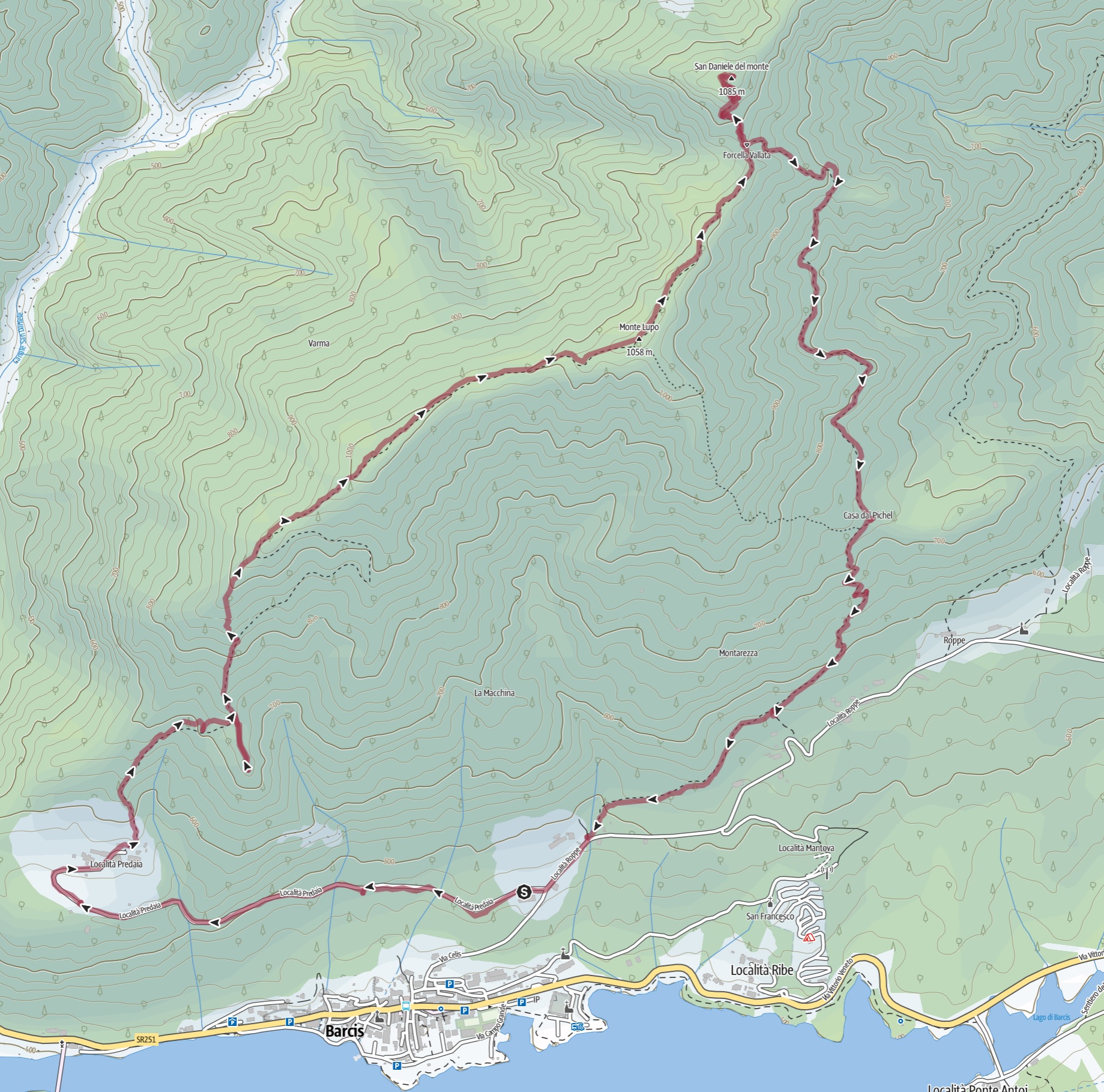 16/04/2023 – L’escursione al monte Lupo e a San Daniele al monte, con partenza dal parcheggio della stazione forestale di Barcis, è una escursione ad anello (percorso in senso orario) molto panoramica, con ampie vedute sul lago di Barcis, il monte Raut, il monte Resettum e la dorsale monte Caulana-Crep Nudo. Giunti in auto a Barcis si seguono le indicazioni per Predaia, parcheggiando presso il parcheggio esterno della stazione forestale; in alternativa si può procedere lungo la strada asfaltata per Predaia e parcheggiare 200 metri oltre la stazione forestale, in corrispondenza di un ampio slargo lungo la strada. Si prosegue a piedi lungo la strada asfaltata raggiungendo il borgo di Predaia; al termine dell’asfalto si trovano le tabelle in legno per il monte Lupo e il monte San Daniele. Il sentiero sale deciso lungo la cresta sud del monte Lupo, percorrendo un sentiero segnalato con segnavia bianco-rossi. Dopo circa 25 minuti dall’inizio del sentiero, si nota a destra una traccia marcata che perde 15 metri di quota e conduce ad un belvedere con grande croce in metallo. Rientrati al bivio si continua a salire lungo il ripido sentiero che segue la cresta, panoramica, fino a raggiungere la cima del monte Lupo (croce in legno appoggiata sul terreno; circa 2 ore dalla partenza). Dalla cima si continua verso nord in discesa sempre lungo la cresta fino a raggiungere la forcella Vallata. Qui si incontra il sentiero CAI 974A che sale da est da Roppe e arriva fino alla cima che ospita i ruderi della chiesetta di San Daniele al monte. Dalla forcella il sentiero sale in modo deciso i 110 metri di salita che permettono di raggiungere San Daniele al monte, posto in una posizione molto panoramica (circa 30 minuti dal monte Lupo). Ogni anno gli abitanti di Barcis andavano in processione fino alla cima dove sorgeva il sacello dedicato a San Daniele, la cui testimonianza risale al 1270. Nel 1806 un fulmine incendiò e distrusse il sacello. Per il rientro, si scende alla forcella Vallata e da qui si seguono le indicazioni del sentiero CAI 974A, che scende a Roppe, lungo il versante est del monte Lupo. A metà circa della discesa si passa accanto ai ruderi delle case Picchel. Il sentiero prosegue in discesa puntando verso Barcis e termina sulla strada asfaltata che collega Barcis a Roppe; in pochi minuti, seguendo la strada asfaltata in discesa, si raggiunge il parcheggio della stazione forestale di Barcis (circa 1 ora e 20 minuti da San Daniele al monte).