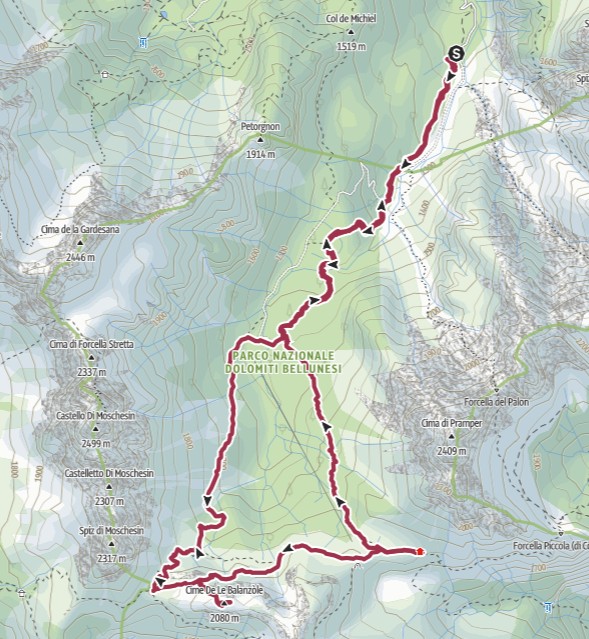 23/08/2023 – L’anello del Moschesin permette di effettuare una escursione ad anello nel Parco Nazionale delle Dolomiti Bellunesi, nella val Pramper, delimitata da Cima Pramper ad est e dal Castello di Moschesin ad ovest. Punto di partenza della escursione è il parcheggio a pagamento di Plan de la Fopa, che si raggiunge in auto da Forno di Zoldo, in direzione di Pralongo seguendo le indicazioni per malga Pramper. Il primo tratto della strada fino al parcheggio di casera del Pian è tutto asfaltato; la larghezza consente il passaggio di una sola auto ma gli allargamenti della strada per permettere il passaggio di due auto sono frequenti. Dal parcheggio di Pian al parcheggio di Plan de la Fopa la strada presenta dei tratti sterrati; la larghezza consente il passaggio di una sola auto e gli allargamenti della strada per permettere il passaggio di due auto sono un po’ meno frequenti rispetto al primo tratto. Il parcheggio a Plan de la Fopa è a pagamento nei mesi estivi (dal 1/6 al 30/9) e per l’intera giornata costa 6 euro; si può pagare con monete e con alcuni tipi di carta di credito. Dal parcheggio si seguono le tabelle in legno che segnalano il sentiero che sale nel bosco in alternativa alla strada di accesso alla malga. Dopo circa 20 minuti il sentiero raggiunge il ricovero del Pian dei Auniz e si ricongiunge alla strada proveniente da Plan de la Fopa. Si percorre la strada per 150 metri circa e dopo aver percorso una curva a destra si lascia la strada e si imbocca a sinistra il sentiero che conduce alla malga Pramper (alternativa alla strada), gestita e aperta come agriturismo, anche con posti letto; percorrendo il sentiero, giunti al pianoro Plan dei Palui a quota 1500 metri, si incontra un bivio segnalato con tabella in legno “Guadi-Strada”. Rimanendo sul sentiero (a sinistra al bivio) si devono superare due guadi sul torrente Pramper. In alternativa si può seguire il sentiero a destra che si ricongiunge alla strada di servizio della malga Pramper e che permette di evitare i guadi. Giunti alla malga Pramper tramite sentiero (circa 1 ora e 30 minuti dalla partenza, escluse soste) si percorre per un centinaio di metri la strada di accesso alla malga in discesa, si passa il ponte sul torrente Pramper e subito dopo si lascia la strada e si seguono a sinistra le tabelle in legno con la scritta “Moschesin”. Si sale con pendenza moderata mediante il sentiero CAI 540. Giunti sotto la forcella Moschesin, si incontra un bivio. A destra si sale alla forcella di Moschesin con il sentiero CAI 543 mentre a sinistra il sentiero CAI 543 porta in traversata al rifugio Sommariva di Pramperet, che incontreremo più avanti in discesa dalla Cima de la Balanzole. Al bivio si prosegue a destra e si raggiunge in pochi minuti la forcella di Moschesin. Dalla forcella si prosegue sul CAI 543 verso sud. Giunti ad un bivio a destra si trovano i ruderi di una casermetta della Grande Guerra. Si prosegue a sinistra, seguendo l’indicazione in rosso “Rifugio Pramperet” su un masso. Il sentiero sale di 50 metri e raggiunge la sella a quota 1980m posta a nord della Cima de la Balanzole. A destra alcune tracce sul pendio erboso/ghiaioso permettono di salire di un centinaio di metri fino alla vetta della Cima (circa 3 ore dalla partenza, escluse soste), che però risulta inaccessibile per la presenza di pini mughi. Si rientra alla sella e si prosegue verso destra, con destinazione il rifugio Sommariva al Pramperet. Il sentiero traversa le pendici nord della Cima de la Balanzole, fino a ricongiungersi con il sentiero CAI 543 che avevamo lasciato sotto la forcella di Moschesin. Un centinaio di metri prima del rifugio si incontra il bivio con il sentiero CAI 523, dove si prosegue dritti. Dopo la sosta al rifugio (circa 1 ora e 30 minuti dalla forcella del Moschesin, compresa la salita alla cima) si ripercorre un tratto del sentiero percorso per arrivare al rifugio e si seguono le indicazioni del sentiero CAI 523 che scende a destra alla malga Pramper. A quota 1750m circa si incontra un bivio senza indicazioni; abbiamo seguito il sentiero a destra in leggera salita. Probabilmente i due sentieri si ricongiungono comunque più avanti. Giunti a malga Pramper (50 minuti dal rifugio) si rientra al parcheggio Plan de la Fopa mediante il sentiero percorso all’andata, oppure tramite la strada di servizio.