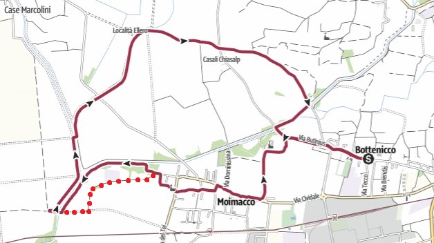 20/01/2024 – La camminata si svolge nelle campagne nei pressi dei paesi di Bottenicco e Moimacco. Punto di partenza della camminata è il parcheggio nei pressi della chiesa di san Giusto. Lungo l’anello i luoghi più significativi che si incontrano sono: il paese di Bottenicco e la villa De Claricini Dompacher, il paese di Moimacco con il monumento ai Caduti e la chiesetta di San Giovanni Battista, le sponde del torrente Chiarò, le sponde del torrente Ellero, i casali Chiasalp. Nella traccia GPS che si può vedere cliccando sul link sottostante, uscendo da Moimacco percorrendo via Gorghis, è stato percorso il sentiero che segue l’argine sinistro del torrente Ellero ma tale sentiero risultava un po’ invaso dagli arbusti; si consiglia pertanto di seguire la pista ciclabile VA4 che raggiunge il guado del torrente Ellero da est (puntinato in rosso nella mappa che si può vedere sotto).