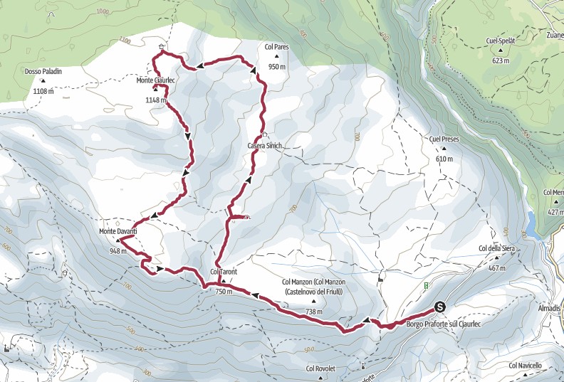 Punto di partenza dell’escursione è il parcheggio nei pressi del punto di partenza del sentiero CAI 850a e della strada che permette di raggiungere il cimitero di Praforte e la chiesa di San Vincenzo. Il punto di partenza si può raggiungere in auto da Travesio seguendo le indicazioni per l’agriturismo “Le genziane”. Dal parcheggio si seguono le tabelle del sentiero CAI 850a per S.S. Trinità e casera Davass; il sentiero rasenta la vetta del Sucul Taront (che saliremo al ritorno) e raggiunge la chiesetta di S.S. Trinità. Si prosegue seguendo il sentiero CAI 850a che sale con pendenza moderata, traversa poco sotto il Col Manzon e si raggiunge il bivio con il sentiero CAI 850 (circa 1 ora dalla partenza, escluse soste). Si prosegue a destra per il sentiero CAI 850 verso malga Sinich e monte Ciaurlec. Il sentiero prosegue in direzione nord e dopo circa 30 minuti si nota sulla destra una traccia nei pressi dei ruderi di casera De Zorzi (non visibili). All’inizio la traccia non è tanto battuta ma dopo pochi minuti ci si immette su un sentiero bollato di rosso; procedendo verso est dopo pochi minuti si raggiunge la foiba detta “Fous di Balancete”. Si rientra seguendo i bolli rossi e ci si immette sul sentiero CAI 850 un centinaio di metri più a nord rispetto al punto in cui lo abbiamo lasciato. Nel punto in cui il sentiero bollato si immette sul sentiero CAI 850 è presente la scritta “Foiba” in rosso su un sasso; pertanto per evitare il primo tratto un po’ incerto si può proseguire fino a questo punto e seguire il sentiero bollato. Si prosegue verso nord e in circa 30 minuti dalla foiba si raggiunge la casera Sinich. Si prosegue sul sentiero CAI 850, si passa nei pressi della casera Tamer, ai due bivi successivi si va a sinistra e poi a destra seguendo le tabelle CAI per il monte Ciaurlec. In circa 1 ora da casera Sinich si raggiunge la cima del monte Ciaurlec. La cima non è panoramica mentre si può godere di un parziale panorama da un cimotto erboso posto a nord-est rispetto alla cima principale. Il cimotto si raggiunge scendendo lungo il sentiero e nel punto in cui si rientra sul sentiero CAI 850 si risale il pendio erboso che si trova difronte. Per il rientro si scende con il sentiero CAI 850 verso sud con destinazione casera Davass. Poco prima di giungere alla casera, dopo essere risaliti di quota di 30 metri, si può deviare a destra per raggiungere la cima del monte Davanti. Dalla cima si prosegue verso est, fino a giungere a casera Davass. Dalla casera con il sentiero CAI 850a si rientra al punto di partenza, passando per la chiesetta di SS. Trinità, dietro la quale una traccia consente di salire al Sucul Taront.