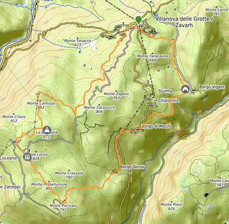 Punto di partenza dell’escursione è il paese di Villanova delle Grotte; alcuni parcheggi si trovano nei pressi della chiesa del paese, difronte al bar oppure nei pressi del cimitero; per un parcheggio più sicuro si può usufruire del parcheggio nei pressi dell’ingresso delle grotte e da tale parcheggio ci si immette sul percorso descritti qui percorrendo la strada asfaltata che porta verso il borgo di Vigant. Partendo dal paese di Villanova delle Grotte, si prosegue sulla strada turistica del Bernadia per poche decine di metri e si prosegue in discesa a sinistra verso le case di Rusa e poi a destra (segnavia bianco-rossi con sigla M e MDL). Giunti alla casa a sinistra con civico 33b, si lascia la strada asfaltata e si segue a destra la tabelle del “sentiero geologico” che entra nel bosco. Si prosegue sul sentiero segnalato da segnavia bianco-rossi; dopo pochi minuti si incontra un bivio con a sinistra l’indicazione per la grotta Doviza. Si prosegue dritti (a destra) raggiungendo in breve la strada asfaltata che collega il parcheggio del terminal delle grotte con il borgo di Vigant. Si segue a destra la strada asfaltata e dopo poche decine di metri si segue a destra il sentiero che porta al vecchio lavatoio (segnavia bianco-rossi). Al lavatoio si segue il sentiero con segnavia bianco-rossi che corre parallelo alla strada appena lasciata. Dopo circa 35 minuti dalla partenza si raggiunge l’ingresso dell’abisso di Vigant. Visitata la parte iniziale dell’abisso, si prosegue sul sentiero e dopo pochi minuti si raggiunge un bivio e si prosegue a destra. Il sentiero, con segnavia bianco-rossi, sale di circa 100 metri di quota e si collega alla strada asfaltata che collega Villanova delle Grotte a Ramandolo, nei pressi del Borgo di Mezzo. Si attraversa il paese seguendo sempre i segnavia; oltrepassato il borgo, si continua in leggera discesa e dopo pochi minuti si segue a destra la strada asfaltata verso il borgo di Tamar. Giunti al borgo si seguono sempre i segnavia bianco-rossi e si prosegue su sentiero (sigla “D” su segnavia bianco-rossi) che risale nel bosco il versante est del monte Pocivalo. Lungo il sentiero si passa accanto ad uno stavolo ristrutturato detto “cason di Dotor”. Si raggiunge la cima del monte Pocivalo (1 ora e 25 minuti dall’abisso Vigant, escluse soste), dove sorge la batteria del monte Pocivalo risalente alla Grande Guerra. Nel piazzale antistante la batteria si segue la tabella bianco-rossa per il Faro. Dopo circa 25 minuti si raggiunge il piazzale (con bel panorama verso la pianura) nei pressi del forte del Bernadia e del Faro Julia. Visitato il faro, si rientra al piazzale e si prosegue in discesa lungo la strada asfaltata via Useunt (stessa direzione provenendo dal monte Pocivalo). Dopo poche decine di metri si oltrepassa l’edificio che ospitava il Corpo di Guardia del Forte e subito dopo si segue a destra la strada sterrata in leggera salita. Dopo 150 metri si raggiunge uno slargo e si prosegue a destra seguendo l’indicazione del sentiero (strada sterrata) “Forte alto”, con segnavia bianco-rossi. La strada prosegue in falsopiano passando accanto alla quota 872 m “La Bernadia” e quota 863 m “Monte Carnizza”. Nei pressi del monte Carnizza la strada si riduce a sentiero e devia verso destra perdendo di quota. Si perviene ad un bivio a quota 780 m (45 minuti dal Faro Julia, escluse soste) e si prosegue a sinistra sul sentiero con segnavia bianco-rossi con sigla “DI”. Il sentiero in leggera discesa corre parallelo alla strada asfaltata che collega il piazzale del forte a Villanova delle Grotte. Dopo circa 35 minuti dal bivio a quota 780 m si raggiungono le case di Dolina. Si prosegue su strada asfaltata e all’incrocio si prosegue dritti in leggera salita e al successivo bivio si prosegue a destra raggiungendo in pochi minuti il cimitero di Villanova delle Grotte e il punto dove è stata parcheggiata l’auto.