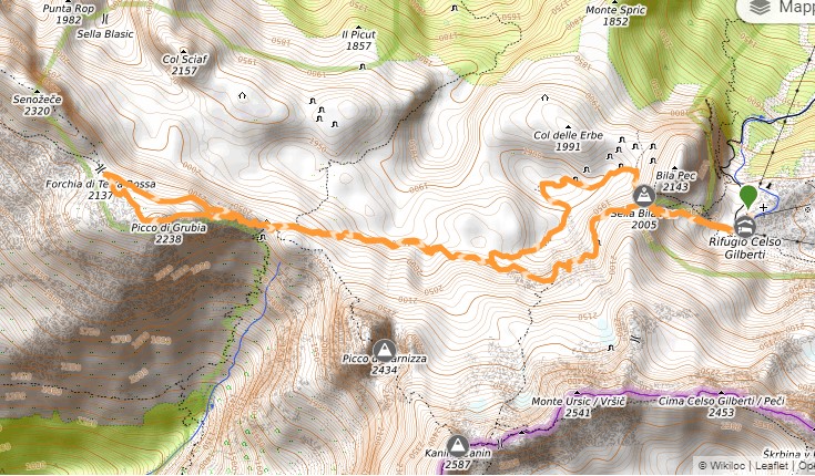 Carta Tabacco 019, sentieri CAI 632 e 632a (sentiero geologico del Bila Pec) e tracce deboli e discontinue sulla cresta del Picco di Grubia. Dislivello 750 m, Lunghezza 11,3 km, tempo indicativo 4.30 h (escluse soste), Difficoltà EE. Altitudine min 1840 circa (bivio sotto al Rifugio Gilberti), max 2240 (Picco di Grubia).
