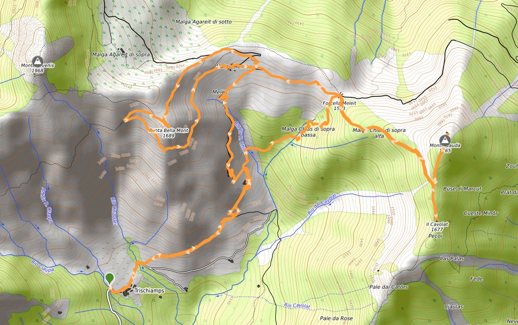 Da forcella Meleit, sulla destra si segue il sentiero indicato dalla tabella CAI per il monte Dauda (CAI 159). Il sentiero sale con pendenza moderata il versante occidentale del monte Dauda, passando accanto ai ruderi di malga Chias di sopra. Rimanendo sul sentiero si raggiunge un bivio a quota 1650 m, segnalato con un segnavia su un masso. Compiendo una curva a gomito a sinistra si segue il sentiero (bollato di giallo) che risale la cresta sud del monte Dauda. Si raggiunge infine la cima panoramica del monte Dauda (circa 1 ora e 40 minuti dalla partenza, escluse soste) mentre la croce di vetta è posta poco più in basso a nord. Dalla cima del monte Dauda, guardando verso nord-ovest si nota malga Meleit e poco sopra si nota molto bene il sentiero che traversa il pendio sopra la malga e porta alla Punta Bella Mont; utilizzeremo tale sentiero per salire la Punta Bella Mont da malga Meleit. Dalla cima del monte Dauda si percorre a ritroso il sentiero di salita; giunti alla curva a gomito a quota 1650m è possibile compiere una breve deviazione a sinistra per raggiungere in pochi minuti la cima del Cavolat. Si rientra alla forcella Meleit e si prosegue a sinistra sulla strada CAI 157 che porta a malga Meleit (aperta nel periodo estivo come agriturismo). Giunti nei pressi della malga si può decidere se effettuare o meno la deviazione per Punta Bella Mont e rientrare a malga Meleit. Per salire la Punta Bella Mont si risale per mulattiera il pendio alle spalle della malga, fino a immettersi sulla strada che collega malga Meleit a malga Agareit alle pendici orientali del monte Arvenis. Giunti a quota 1580m si lascia la strada (nei pressi di una vasca prefabbricata in cemento sul bordo sinistro) e si segue a sinistra la traccia che traversa verso Punta Bella Mont. La traccia, vista in precedenza dal monte Dauda, risulta invasa dagli arbusti e pertanto è faticosa da percorrere. Con un po’ di fatica si raggiunge la cima erbosa della Punta Bella Mont (circa 1 ora e 20 minuti dal monte Dauda, escluse soste). Per il rientro utilizziamo la mulattiera che scende sul versante opposto rispetto a quello di salita, mulattiera che scende fino a immettersi sul sentiero CAI 158 (che collega malga Claupa con malga Meleit) che si segue a sinistra fino a raggiungere malga Meleit. Dalla malga si scende verso malga Chias di sotto utilizzando la strada cementata di servizio. Giunti a malga Chias di sotto si chiude l’anello e mediante la strada percorsa all’andata si rientra a Trischiamps (1 ora e 20 minuti da Punta Bella Mont, escluse soste).
