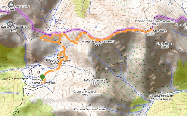 Carta Tabacco 09, sentieri CAI 402 e 448, scorciatoie non segnalate, liberamente il breve tratto per raggiungere la cima dello Scarniz. Dislivello 800 m, Lunghezza 10,2 km, tempo indicativo 4.30 h (escluse soste), Difficoltà EE (E fino ai ruderi della casermetta sotto la Cuestalta), altitudine min 1521 (Casera Promosio), max 2198 (Cuestalta).