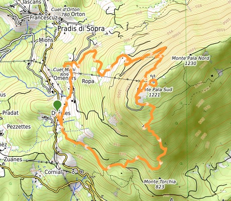 Per raggiungere il punto di partenza, da Clauzetto si seguono le segnalazioni per Pradis di Sopra raggiungendo in breve il bivio per Zuaniers e Rope (cartelli stradali) e malga Polpazza (tabella in legno). Venti metri prima del bivio si può parcheggiare a destra a bordo strada. Ci si incammina seguendo le indicazioni per malga Polpazza; al successivo bivio proseguiamo a sinistra (al rientro giungeremo a questo bivio dalla strada di destra) e attraversiamo i borghi di Zuaniers e Rope. Oltrepassate le ultime case di Rope troviamo un bivio con indicazioni a destra per la pista di servizio di malga Polpazza; prima di seguire questa pista possiamo fare una breve deviazione a sinistra con la mulattiera che ci porta alla cima del Cuel Moni. Si sale per la pista di servizio asfaltata e si raggiunge il pendio che ospita malga Mezzol. Per chi vuole, si può proseguire nel bosco e tagliare un tratto della pista, seguendo una traccia poco battuta che parte dietro la casera Mezzol. Riguadagnata la pista, si oltrepassa il tornante a quota 1050m. Dopo 200 metri a sinistra si vede una traccia battuta che permette di tagliare un altro tratto della pista di servizio di malga Polpazza. Questa traccia risulta abbastanza battuta ma da quota 1150m sono presenti numerosi schianti; si passano con qualche difficoltà e pertanto si consiglia di seguire la pista di servizio. Il sentiero termina nei pressi di una recinzione che si segue a destra, pervenendo ad un cancello (circa 1 ora e 40 minuti dalla partenza), appena sopra il pianoro che ospita malga Polpazza. Si entra nella zona recintata e si prosegue per la pista di servizio che raggiunge la zona con antenne erette nei pressi del monte Pala Sud (cima priva di panorama). Si torna indietro, si raggiunge malga Polpazza (in corso lavori di ristrutturazione) e si prosegue in discesa per la pista di servizio cementata. Appena superato a sinistra un pannello in legno con la scritta “Malga Polpazza – M.te Pala” si lascia la pista e si prosegue a sinistra seguendo la tabella in legno “Alla croce”. Il sentiero perde quota fino a raggiungere un pianoro con tavolo e panche, a quota 1100 metri; difronte troviamo un piccolo dosso roccioso che risaliamo con una breve scalinata in pietra. Sul fronte opposto del dosso è stata eretta una piccola cappella e una grande croce con punto panoramico (15 minuti da malga Polpazza); il luogo è chiamato Pic di Pala. Rientrati al pianoro con tavolo e panca proseguiamo a destra seguendo la tabella per “Località Corona – Clauzetto”; il sentiero è segnalato con bolli rossi, attraversa un bosco con numerosi faggi secolari e transita nei pressi dei ruderi di “Planc dal Lat”. Dopo circa 35 minuti dal Pic di Pala il sentiero raggiunge una strada forestale, che si segue a destra. Dopo circa 15 minuti di camminata si raggiunge il tornante nei pressi di Zuaniers e scendendo a sinistra si raggiunge il punto di partenza della escursione.