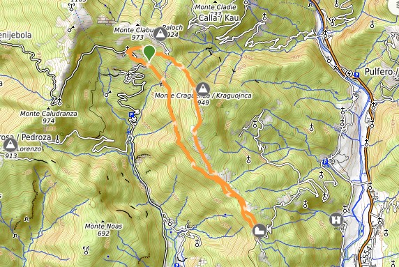 Punto di partenza è la parte alta del paese di Masarolis, raggiungibile da Torreano tramite la comoda strada asfaltata che percorre il fondovalle; giunti alle case della Rieca, si lascia a sinistra il bivio per Reant e si prende a destra una strada asfaltata più stretta e tortuosa, che sale a Masarolis. Si oltrepassa il paese, portandosi al bivio con la strada militare, dove si lascia l’auto (limitate possibilità di parcheggio). Tralasciate a destra le indicazioni per Pulfero e Spignon, ci si incammina a sinistra in salita sull’asfalto verso Tamoris e Canebola; dopo circa 400 metri, si approfitta di una larga scorciatoia per tagliare un tornante; si sbuca così a Tamoris, nei pressi di una cappelletta; si procede a destra ancora per qualche decina di metri, sino a raggiungere il bivio tra la strada che prosegue verso Canebola a sinistra ed una larga pista cementata a destra; proprio sull’incrocio è stato recentemente posizionato un grande tabellone illustrativo relativo all’opera militare “Le Bocchette di Calla”. Noi prendiamo a destra, e proseguiamo sulla pista per circa 900 metri; giunti ad un tornante, se la crescita della vegetazione lo consente, conviene utilizzare una “bretella” di poche decine di metri, che si ricollega immediatamente al sentiero CAI 752 e alla lieve insellatura della Bocchetta di Calla. Il sentiero prosegue entrando nel bosco e salendo senza difficoltà con qualche svolta lungo il crinale nord del Craguenza, sino a raggiungere l’inizio dei prati in prossimità della cima ovest, che si trova sul margine del bosco ed è segnalata da un paletto che indica la quota m. 949. Da questo punto, tramite cammino di pochi minuti su sentiero che corre in prossimità della cresta, si perviene anche alla cima est, più panoramica, con cassettina e quaderno di vetta, panchina e nicchia con Madonnina (0.40 h dalla partenza). Ritornati sui propri passi sino ai prati, si percorre piacevolmente la lunga dorsale erbosa meridionale in discesa, giungendo ad un’insellatura dove c’è eventualmente la possibilità di ricollegarsi direttamente alla strada militare che utilizzeremo per il ritorno, abbreviando l’anello. Noi invece proseguiamo ancora in contropendenza sul sentiero CAI sui prati e poi entriamo nel bosco, sbucando infine sul retro della chiesetta di Santo Spirito (1.30 h). Scendendo nel prato sotto la chiesetta si guadagna la strada militare (bivio con segnalazioni CAI); tralasciando le prosecuzioni per Spignon e Puller e – subito dopo – la pista che scende a sinistra verso Torreano, si prosegue lungo la strada militare che corre con qualche saliscendi alle pendici del Craguenza e, dopo circa 4 km ci riporta al bivio sopra Masarolis, da dove eravamo partiti (2.30 h, soste escluse).