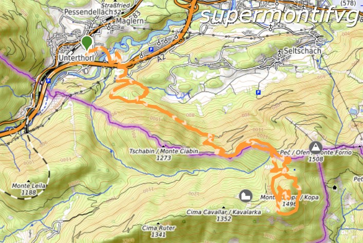 Provenendo da Tarvisio sulla Strada Statale, si oltrepassa il valico di Coccau e si gira a destra, dirigendosi verso la chiesa isolata di Unterthörl con annesso cimitero, dove si può comodamente lasciare l’auto in un ampio parcheggio. Dando le spalle alla chiesa, ci si dirige verso le case sulla destra e si inizia a seguire su strada il segnavia 603, che scende ad attraversare lo Slizza (Gailitz) su una robusta passerella in legno, compie una larga ansa, passa sopra al tracciato autostradale, raggiunge le ultime case e poi finalmente inizia a salire con pendenza tranquilla sul versante nord del Monte Ciabin. Ai vari bivi, in genere ben segnalati da cartelli, ci si tiene sempre sul segnavia 603, seguendo la direzione ”Dreiländereck” (=Monte Forno). Si sale lungamente al riparo nel bosco sino a quota 950 circa, dove il segnavia abbandona la strada per seguire un sentiero sulla destra. Il sentiero prende a salire in un meraviglioso bosco di faggi e abeti, compie alcune svolte, oltrepassa una zona esboscata (fondo umido e fangoso) e poi intercetta nuovamente una pista forestale, che si percorre per un breve tratto verso est sino ad una radura con stavolo, dove la si abbandona per seguire invece tutta la boscosa dorsale del Monte Comizza, dove corre il confine italo-austriaco. In discesa dal Comizza, giunti ad una piccola insellatura nel bosco, si piega a destra in territorio italiano, raggiungendo presto la graziosa radura del Bivacco Senza Confini (3.00 h dalla partenza, soste escluse), aperto e ben attrezzato. Di fronte al bivacco, tralasciati la strada che scende ed il sentiero che prosegue verso destra, si segue più sulla sinistra una traccia che si alza nel bosco e, ad un bivio poco evidente, ci si tiene ancora a sinistra. Il sentiero sale con qualche svolta e poi – attorno a quota 1400 – inizia l’aggiramento – con un lungo traverso e qualche saliscendi – di tutta la parte sommitale del monte, sino a portarsi sul suo versante ovest, ove sbuca su di una sterrata; poco più avanti, si lascia la pista che scende, per alzarsi a destra su quel che resta della vecchia strada di accesso al Caposaldo, che sale a tornanti restringendosi progressivamente fino a trasformarsi in un sentierino; questo passa davanti alla caserma – ormai immersa nella vegetazione – e termina poco oltre, a nord del punto trigonometrico della cima, che può essere facilmente raggiunto con breve percorso tra alberi e qualche schianto (m. 1497 – 4.00 h). Per il rientro, si torna sui propri passi sino a riportarsi sulla strada sterrata, che si percorre in discesa sino al primo tornante (quota 1340 circa). Qui, nell’erba piuttosto alta, si stacca una traccia che si addentra nel bosco portando a termine il periplo del monte e raccordandosi alla via dell’andata al bivio poco sopra il Bivacco Senza Confini. Dal bivacco si ridiscende, prima per sentiero e poi per pista forestale, in direzione del Comizza ma, anziché ripercorrerne la dorsale, si continua lungo la strada che corre sul versante nord, per poi far ritorno alla chiesa di Unterthörl per lo stesso percorso di salita (N.B. la variante di discesa da noi compiuta nella parte bassa e registrata dalla traccia non è consigliabile per l’assenza di sentiero).