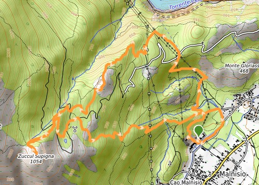Il punto di partenza è il parcheggio posto nei pressi della ex-centrale idroelettrica “Antonio Piller” di Malnisio. Si raggiunge la base del pendio che ospita le 4 condotte forzate che alimentavano le turbine della centrale e si risale il sentiero MV07 (segnavia giallo-azzurro) a tornanti che risale il pendio di 50 metri, a destra delle condotte forzate. Si raggiunge la vasca di carico e si segue il sentiero verso est che corre alla base del muro di contenimento del canale adduttore che alimentava la vasca di carico. Seguendo questo sentiero per circa 10/15 minuti si raggiunge un incrocio di sentiero, dove è presente un ponte sul canale (sul ponte transita il sentiero CAI 987 che seguiremo al ritorno). Si prosegue dritti seguendo il sentiero locale MV07 che ora corre lungo la sommità del muro laterale del canale adduttore, con parapetti su entrambi i lati del muro. Si giunge in breve allo sfioratore a gradoni sul Rio Bennata e successivamente alla zona nei pressi dello sbocco della galleria della Monciaduda, galleria scavata nella roccia, proveniente dalla val Cellina; le acque che alimentavano la centrale venivano prelevate dal torrente Cellina tramite la “Vecchia diga” sul torrente Cellina, posta a sud della diga di Barcis. Nei pressi dello sbocco della galleria si seguono le indicazioni del sentiero MV08 “Sentiero Cjasarile” che sale a tornanti e ci porta alla strada asfaltata proveniente da Grizzo. Poco prima di raggiungere la strada asfaltata, si intercetta il sentiero MV02 che sale da Grizzo; percorrendolo per 10/20 metri la vista si apre sulla pianura. Seguiamo a sinistra per poche decine di metri la strada asfaltata e seguiamo a destra le tabelle del sentiero MV02 per casera Rupeit. Dopo circa 15 minuti si raggiunge il bivio con il sentiero CAI 996; proseguendo dritti si raggiungono le strutture di Val de la Roja. Superati gli edifici si trova un pannello con la pianta dei sentieri locali della zona e si seguono a destra le indicazioni del sentiero MV02 per casera Rupeit. Dopo circa 30 minuti si incontra il bivio con il sentiero MV05 per Cao Malnisio, che utilizzeremo per il rientro. Superato il bivio, dopo poche decine di metri, si incontra un bivio non segnalato e proseguendo a sinistra si raggiunge il pianoro panoramico di Sucul Confermous (circa 2 ore dalla partenza escluse soste). Si prosegue in direzione del Zuccul Supigna Dopo pochi minuti il sentiero fa una svolata e destra e subito dopo si incontra un bivio e si prosegue a sinistra. Dopo pochi minuti il sentiero intercetta una pista forestale, che coincide con il sentiero CAI 987. Si attraversa la strada e si prosegue sul sentiero MV02 “Troi dei vols” che prosegue nella boscaglia. Dopo pochi minuti il sentiero raggiunge una seconda strada forestale, dove sul lato opposto si trova una grande tabella in legno con la scritta “Cuol Salaris”. Si attraversa la strada e si continua a salire sul sentiero che sale veros il Zuccul Supigna. Dopo poco più di 10 minuti si giunge alla sella di quota 1005m posta a nord del Zuccul Suppigna. Dalla sella per tracce si risale il pendio erboso che ci porta in pochi minuti alla cima erbosa del Zuccul Supigna (2 ore e 50 minuti dalla partenza, escluse soste). Per il rientro si ripercorre il sentiero percorso in salita fino al punto in cui si incontra la strada nei pressi della tabella in legno “Cuol Salaris”. Qui si segue la strada a destra in discesa, si oltrepassa la stalla di casera Pian della Corona e al successivo bivio di strade forestali si prosegue a destra. Dopo pochi minuti si lascia la strada e si seguono le indicazioni a destra del sentiero CAI 987 proveniente dalla Pala d’Altei e che scende verso borgo Alzetta. Il sentiero CAI intercetta l’ex-canale di carico con il ponte incontrato all’inizio della escursione. Dopo aver attraversato il ponte si continua a scendere sul sentiero CAI 987 e si giunge infine al canale di scarico della centrale e seguendo i segnavia giallo-azzurro, dapprima sulla sponda destra e poi sulla sponda sinistra, si rientra alla ex-centrale idroelettrica.