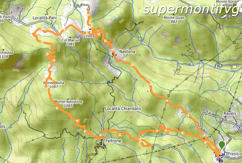 Carta Tabacco 013. Sentieri locali, in parte marcati con segnavia biancazzurro, strada asfaltata. Sviluppo 13,8 km, dislivello 700 m, tempo complessivo di marcia 4.00 h (soste escluse), difficoltà E. Altitudine minima 545 m circa (passaggio sul Torrente Filuvigna, tra Fresis e Feltrone), max 1150 m (dorsale est Monfredda)