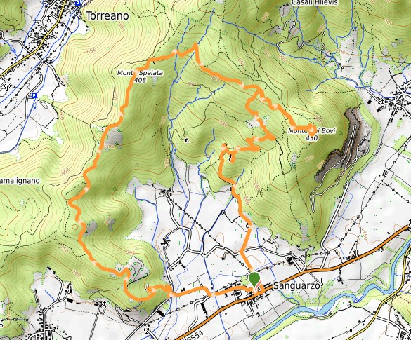 Carta Tabacco 041, strade sterrate ed asfaltate e breve tratto di sentiero, Dislivello 350 m, Lunghezza 11,9 km, Tempo indicativo: 3h10m (escluse soste), Difficoltà T (con traccia GPS), Altitudine min 145 m (Sanguarzo), Altitudine max 430 m (Monte dei Bovi).