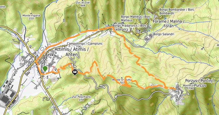 Punto di partenza della escursione è il parcheggio pubblico dietro la chiesa di Attimis. Si prosegue a piedi su via Pecolle puntando verso il versante boscoso a nord dove si notano i ruderi del castello inferiore. La strada asfaltata sale e si trova la prima tabella del percorso con l’indicazione dei sentieri A1 e A4 per “Porzus (sentiero CAI) – Castelli di Attimis”. Il sentiero A1 coincide con il sentiero CAI 765. Raggiungente le ultime case, la strada diventa una mulattiera che sale nel bosco. A quota 310m al bivio si segue a sinistra l’indicazione per il Castello inferiore lasciando a destra il sentiero CAI 765. Al successivo bivio si prosegue a destra in salita seguendo la tabella “Castello inferiore”. Oltrepassato il castello inferiore il sentiero rientra sul sentiero CAI (al bivio a sinistra). Poche decine di metri dopo al bivio si segue a destra la tabella “Castello superiore” e si lascia a sinistra il sentiero principale CAI che ritroveremo dopo aver visitato i resti del castello superiore. Tornati sul sentiero principale CAI si raggiunge la strada asfaltata che da Attimis sale a Porzus (tabelle CAI) (45 minuti dalla partenza). Proseguendo sulla strada asfaltata si nota a destra una tabella del sentiero locale A4 che scende al castello di Partistagno. Si ignora questa tabella e si continua sula strada asfaltata per una decina di metri e si prosegue a sinistra per la strada sterrata (che poi diventa mulattiera) che risale il versante ovest del monte Scalutta. Giunti ad una selletta a quota 520m si incontra una tabella in legno “M.te Scaluta” che ci invita a proseguire sul sentiero in direzione della cima. Giunti a quota 650 m si incontra un bivio dove si prosegue a sinistra lasciando a destra il sentiero locale A6 che scende al castello di Partistagno e a Racchiuso. Il sentiero A1 ora sale per il versante sud del monte Scalutta e oltrepassa il limite inferiore del pendio erboso utilizzato per il lancio con parapendio. Giunti a quota 690m si incontra un bivio e si prosegue a sinistra seguendo la tabella “Postazione lancio parapendio”. In pochi minuti si raggiunge il pendio panoramico (con panchina) utilizzato per il lancio con parapendio (1 ora e 45 minuti dalla partenza, escluse soste). Proseguendo oltre il pendio si può raggiungere in pochi minuti la cima nel bosco del monte Scalutta. Tornati alla panchina si prosegue per Porzus, prossima meta della escursione. Nei pressi della panchina è presente una tabella “Porzus” che indica un sentiero (non molto battuto) che riporta al sentiero CAI 765 nei pressi dei prati stabili di “Balla” di Porzus. Questo sentiero non è molto battuto e si consiglia in alternativa di rientrare sul sentiero CAI 765 tramite il sentiero percorso all’andata fino al bivio con la tabella “Postazione lancio parapendio”. Oltrepassati i prati stabili di “Balla” si prosegue sulla strada sterrata in direzione di Porzus. Nei pressi del paese si attraversano dei prati caratterizzati dalla presenza di numerosi muretti a secco e sulla sinistra si nota la tabella che segna l’inizio del sentiero A3 per “Forame (B.go Ponte)”, che percorreremo per scendere a Borgo Ponte dopo aver raggiunto la piazza di Porzus per una sosta (20 minuti dal monte Scalutta), con il chiosco della Proloco di Porzus che è aperto la domenica mattina dalle 10 alle 14. Per rientrare ad Attimis, si ripercorre un tratto della strada appena percorsa scendendo dal monte Scalutta fino all’inizio del sentiero A3 con tabella “Forame (B.go Ponte)”. Questo sentiero è dedicato a Teresa Dush. Il sentiero risulta in ombra nel periodo invernale; nonostante si sia stato percorso in un periodo di assenza di piogge, risultava scivoloso soprattutto nella prima metà più alta. Il sentiero raggiunge la strada asfaltata che collega Borgo Ponte a Borgo Salandri e si segue la strada a sinistra in discesa e in pochi minuti si raggiunge Borgo Ponte. Si prosegue a destra percorrendo il ponte sul torrente Malina e, subito dopo il ponte, si segue a sinistra l’indicazione per borgo Minins, su strada asfaltata. Al successibo bivio, prima del borgo, seguire a sinistra la strada sterrata (tabella “Attimis”). La strada segue in sponda destra il torrente Malina fino a raggiungere la zona del campo sportivo di Attimis. Guinti al ponte sul torrente Malina, si percorre il ponte e si rientra al parcheggio dietro la chiesa, punti di partenza della escursione (1 ora e 35 minuti da Porzus, escluse soste).
