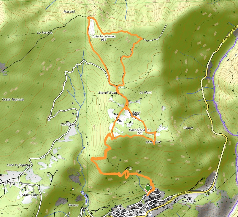 Carta Tabacco 028, sentieri segnalati “Il Troi dai Asins” e sentieri non segnalati, Dislivello 650 m, Lunghezza 8,5 km, Tempo indicativo: 3h15m (escluse soste), Difficoltà E, Altitudine min 373 m (parcheggio chiesa di Anduins), Altitudine max 934m (Colle San Martino).