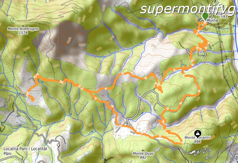 Carta Tabacco 013, strade asfaltate e cementate (quelle di salita con segnavia CAI 221), sentieri locali ben segnalati. Sviluppo 15,5 km. Dislivello 770 m. Tempo indicativo di marcia 4.30 h (escluse soste – con condizioni di parziale innevamento). Altitudine min 510 m (Muina), max 1050 m (carrozzabile poco oltre il Casolare Fieris). Difficoltà E.