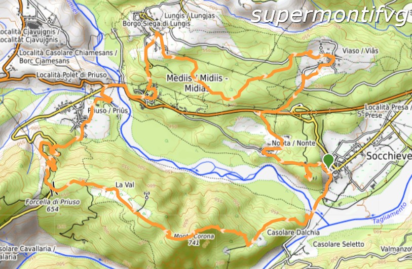 Lasciata l’auto a Socchieve nell’ampio parcheggio di Via Lenna (m. 407), non distante dalla chiesa, ci si avvia sulla stessa via verso sud, uscendo presto dal paese; passato il largo guado carrabile sul Lumiei, si individua subito sulla destra il cartello biancorosso CAI con il segnavia 239, che indirizza su una stradina asfaltata che sale nel bosco sino all’ampia radura del Casolare Dalchia. Oltrepassato il casolare, il segnavia CAI abbandona la strada e entra nel bosco sulla destra. Sempre seguendo i segnavia (oltre a quelli CAI presenti anche segnalazioni biancazzurre), si affronta la ripida dorsale orientale del Monte Corona. Il sentiero risale il pendio dritto per dritto, la pendenza è sostenuta, ma salita è abbastanza breve e in meno di un’ora dalla partenza si raggiunge il Monte Corona (m. 742). La cima – boscosa e senza panorama – si trova su un piccolo cocuzzolo sulla destra del sentiero, ed è indicata da un cuore di legno ricavato da un vecchio tronco. Sul ripiano appena sotto il cocuzzolo è presente un’opera militare coperta da una vecchia grata oggi seminascosta dalla neve, prestare attenzione! Si prosegue in piano lungo una stradina lungo il crinale del monte, che inizialmente risulta piuttosto scosceso da entrambi i versanti, ma poi si fa via via più largo e lascia spazio a ampie radure, oggi ben imbiancate, dalle quali si aprono begli scorci panoramici, in particolare verso il Tinisa ed il Passo del Pura. Oltrepassato il bivio per Chiarpignas (antenna), la strada inizia a scendere tranquillamente verso la Forca di Priuso (m. 654 – 1.30 h), dove confluisce sulla rotabile asfaltata per il Passo di Monte Rest, che si segue a destra; la strada scende verso Priuso abbastanza ripidamente con diversi tornanti, che possono eventualmente essere tagliati tramite scorciatoie segnalate; all’interno di un tornante si trova la bella chiesetta della Madonna del Vergon, affrescata internamente. Scesi sulla strada sino a quota 550 circa ed oltrepassata una breve galleria, si imbocca sulla destra una mulattiera lastricata, che porta in breve a Priuso nei pressi della chiesa di San Giacomo (2.00 h). Costeggiato il paese ed abbandonato il segnavia CAI, si seguono le segnalazioni dei sentieri locali, in particolare il n. 4 (Ampezzo-Priuso-Mediis); oltrepassate le case di Priuso, ci si porta nella zona del campo sportivo, si passa il ponte sul Lumiei e poi si sale verso la statale, che si percorre a destra per un breve tratto, sino a seguire sulla sinistra le indicazioni per Mediis. Entrati in paese e percorsa la via principale, si svolta a sinistra sulla strada che sale a Lungis. Seguendo i segnavia bianco-azzurri, è possibile tagliare un paio di tornanti; al bivio sotto il borgo di Lungis, ci si tiene a destra restando fuori dal centro e si incontra un nuovo cartello con l’indicazione del sentiero locale n. 8 Lungis-Viaso. Si continua sulla strada e, sempre guidati dai segnavia, si costeggia la recinzione di un’azienda agricola e si sbuca su una mulattiera che entra nel bosco e prosegue con qualche saliscendi verso est. I segnavia – anche con il numero del sentiero – sono sempre numerosi e ben posizionati. Si esce infine sulla strada asfaltata proveniente da Lungis, ad una radura con crocifisso poco prima di Viaso (3.20 h). Si passa per la via principale del paese e, nella piazzetta, si trova un tabellone con breve descrizione di alcuni storici sentieri locali. Si segue il percorso n. 15 Viaso-Nonta-Socchieve, svoltando a destra e scendendo verso il fondovalle per la strada asfaltata (il segnavia invita a tagliare per il prato sotto il paese, ma non fa molta differenza) sino al tornante sopra la Strada Statale, che si raggiunge tramite una breve scorciatoia. Percorso un centinaio di metri sulla Statale verso ovest (destra) e oltrepassato un sottopasso, al bivio si segue a sinistra la strada che sale verso Nonta; attraversato tutto il borgo, si prosegue verso Socchieve, giungendo – dopo circa 400 metri – al parcheggio della suggestiva Pieve di Santa Maria Annunziata, arroccata sul Colle di Castoia, che domina Socchieve. Il panoramico spiazzo a sud della pieve è occupato dalle lapidi dell’antico cimitero, adiacente a quello moderno. Terminata la visita esterna alla Pieve, si ridiscende alla strada, che porta in pochi minuti a Socchieve, proprio in corrispondenza del parcheggio dove si era lasciata l’auto (4.00 h).