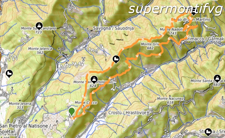 L’escursione prende avvio da Clastra, dove si può lasciare l’auto in una delle due piccole piazzole prima della chiesa. Al bivio con crocifisso, si trova anche la tabella CAI con il segnavia 761, seguendo il quale ci si avvia sulla dorsale, inizialmente su strada e poi su comoda mulattiera, sempre ben segnalata e mantenuta. Oltrepassati alcuni bei prati, il sentiero entra definitivamente nel bosco, ed inizia a traversare con piccoli saliscendi, tenendosi sempre sul versante nord del crinale. Dopo un’oretta scarsa dalla partenza, si arriva alla piccola radura con la bella chiesetta di Santa Lucia, ancora saltuariamente utilizzata, ma chiusa. Altri 20 minuti di piacevole cammino nel bosco e si raggiunge anche Sant’Egidio, con la sua chiesetta, ridotta ormai a pochi ruderi, ma con un suggestivo arco a sesto acuto ancora in piedi. Si prosegue sempre con qualche saliscendi, si sfiora il cimotto del Grič e poi ci si porta in corrispondenza del Nad Dolino, che si raggiunge affrontando liberamente il boscoso pendio (primo tratto piuttosto ripido e anche un po’ scivoloso), sino ad individuare la vetta, immersa nel bosco ma identificabile grazie all’ometto e alla scritta posti a suo tempo dal Cai Valnatisone (m. 743 – 2.05 h); per la discesa, si segue una vistosa bollatura rossa, che si tiene sulla dorsale nord, sino ad intercettare nuovamente il segnavia CAI 761 in corrispondenza di una curva; qui il sentiero si allarga e diventa una stradina, che scende tranquillamente sino a sbucare sulla carrozzabile del Passo di San Martino. La ripresa del sentiero (segnalata) oltre la strada consente di portarsi in pochi minuti nella radura della Baita sotto al San Martino, gestita dal Cai Valnatisone (m. 679 – 2.30 h). Ritornati al passo, si segue la strada asfaltata in discesa in direzione di Grimacco; dopo circa 200 metri, si prende a sinistra un sentierino segnalato che porta subito al “Gigante buono di Canalaz”, un gigantesco castagno con una storia di oltre 400 anni alle spalle. Oltrepassata la maestosa pianta, il sentiero compie un tornante, passa accanto all’edificio del vecchio essiccatoio del fieno e poi scende al borgo di Canalaz, tutto da scoprire! Per il rientro, ci si porta sotto alle case sulla strada asfaltata principale, che inizia a scendere con un paio di tornanti. Passato il paesino di Plataz, si perviene ad un bivio, dove ci si tiene a destra in direzione di Grimacco. Dopo circa 600 metri, al bivio successivo, si procede ancora a destra, raggiungendo Grimacco superiore. Oltrepassate le ultime case, la strada si fa sterrata e prosegue lungamente con andamento tortuoso, traversando alla base di tutta la dorsale percorsa nella prima parte dell’escursione; ancora un breve tratto asfaltato tra le case di Cernizza e quelle di Prehod, e la strada, ridiventata a fondo naturale, risale di un buon centinaio di metri di quota e si riporta poco sopra Clastra, chiudendo l’anello (4.45 h).